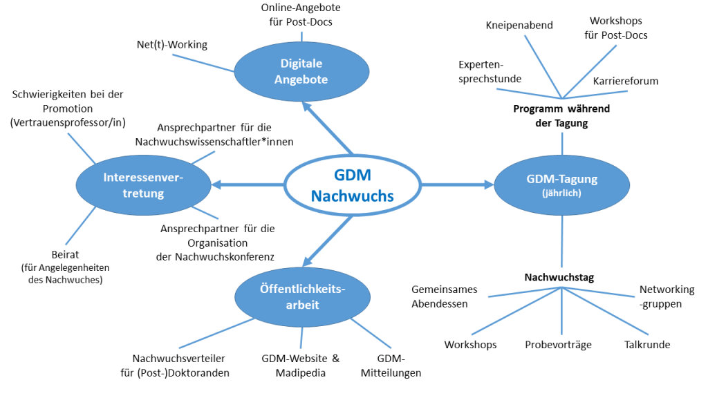 3. Wir stehen regelmäßig in Kontakt mit dem Vorstand und Beirat der GDM (auch durch unsere Plätze im Beirat), um hier die Perspektiven aus dem Nachwuchs einzubringen und auf Anliegen, die den Nachwuchs besonders betreffen, aufmerksam zu machen.